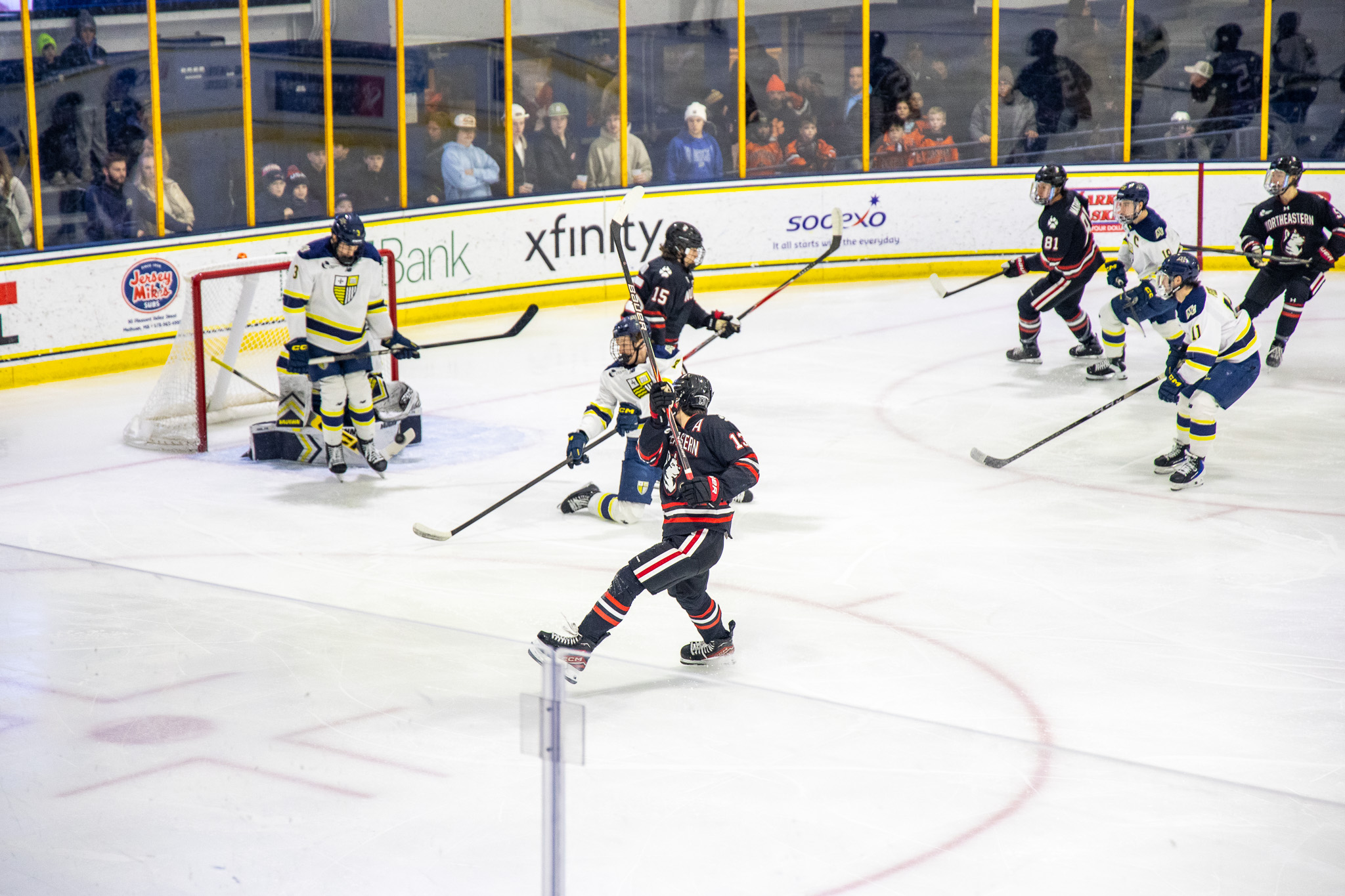 As time ticked down with the goal difference still at one, Zacher left his crease, and Northeastern found its stride during the six-on-five. Following a few dangerous-looking shifts from their top two offensive lines, the special teams succeeded in cycling the puck and getting shots off in central areas, but Merrimack just did a better job of getting their bodies in the way. The Warriors had a staggering 23 blocks throughout the course of the game, negating many chances the Huskies could muster up.