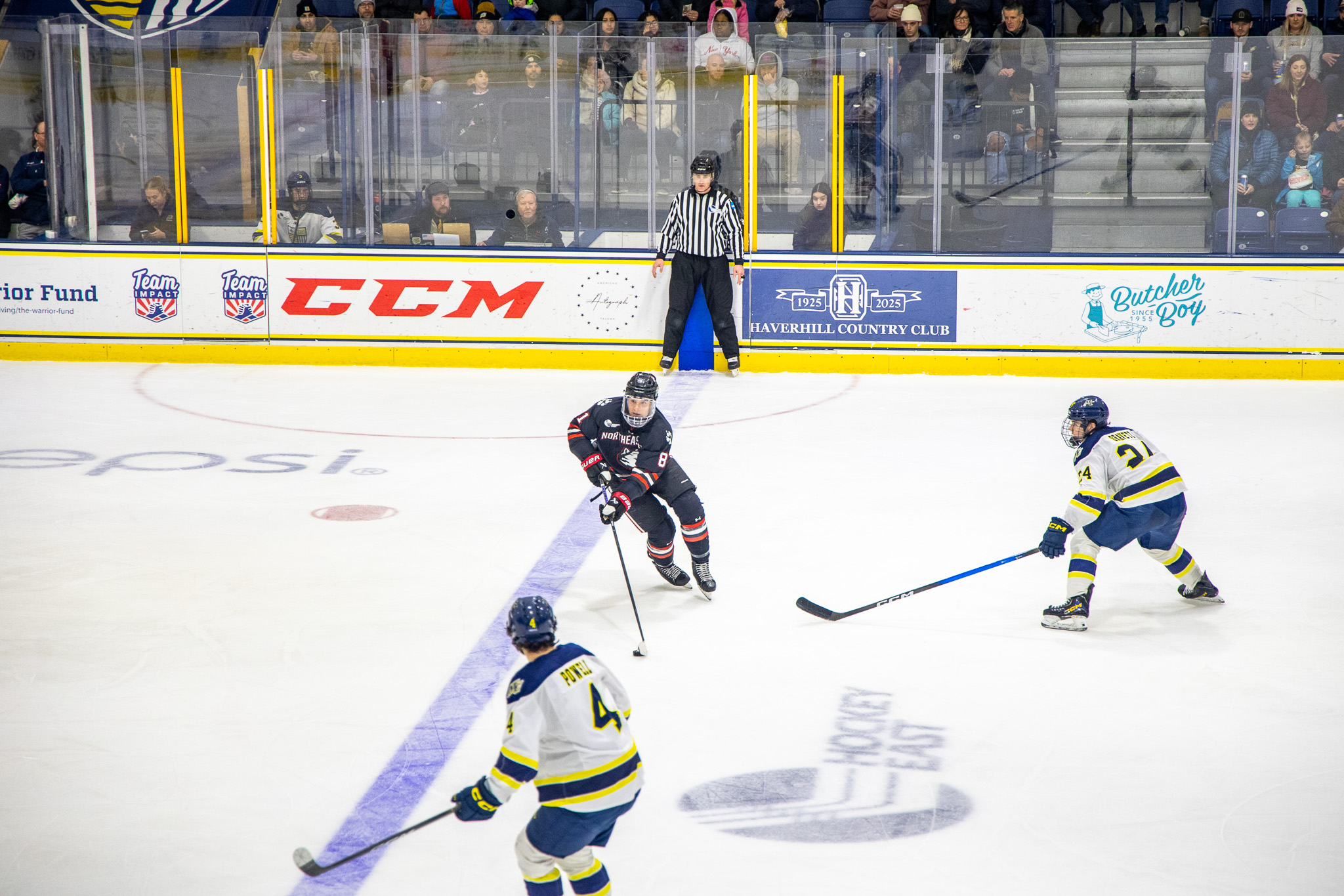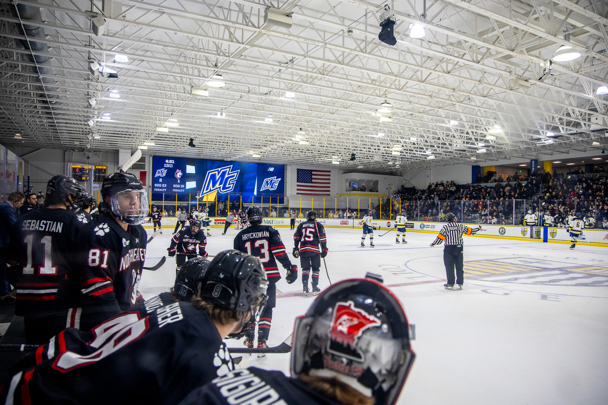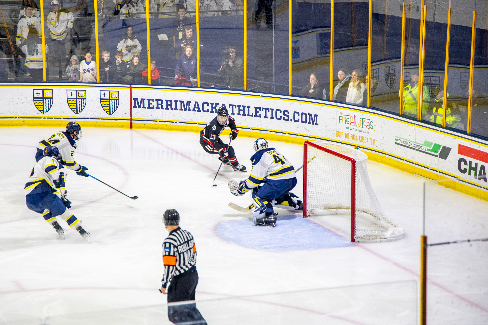 In contrast to Thursday night’s game, Northeastern came out of the gate hot, dominating possession play immediately. They controlled the offensive zone, whereas Merrimack struggled with zone entries. But despite the Huskies’ strong play in transition, Merrimack’s backcheck negated most of the visitors’ chances.