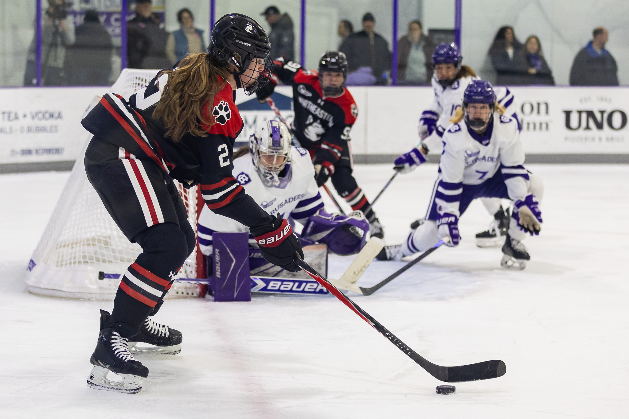 Holy Cross continued to push, earning its third power play with 8:01 remaining after an interference call, but Northeastern’s penalty kill erased the chance without issue. With 2:30 left, the Crusaders pulled Hornung for the extra skater, and the gamble paid off instantly. Junior forward Reghan Chadwick buried a rebound at the back door to cut the deficit to one with 1:53 remaining.