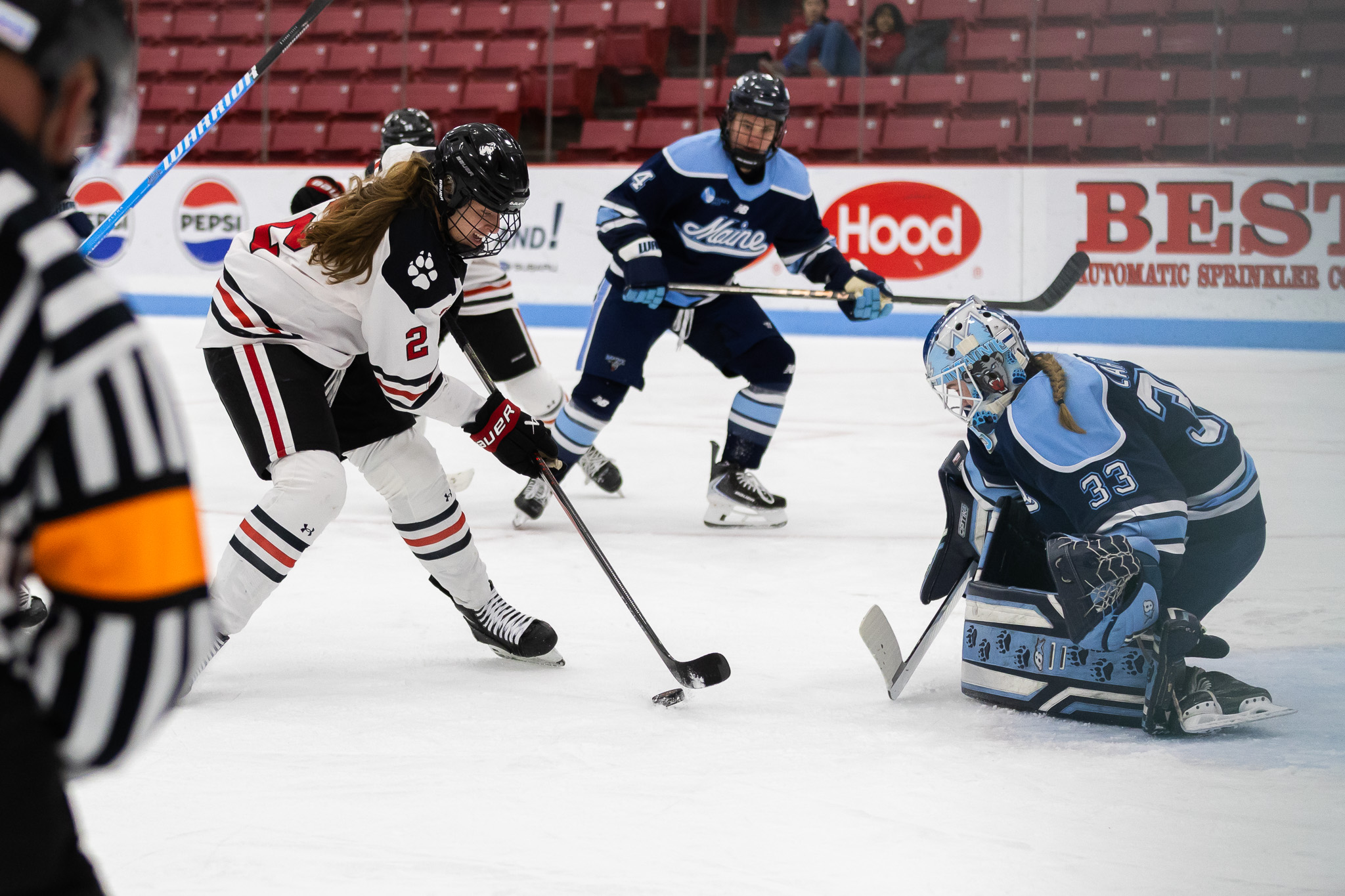 The Huskies claimed momentum quickly with the first of five goals during a power play within the first three minutes of the match. After forcing the Black Bears to lose their composure with seemingly endless time in the offensive zone, defenders Ella Lloyd and Kristina Allard combined for the assist on a well-placed shot from junior center Allie Lalonde. After finding a lane through some blue line passes from her teammates, Lalonde fired from the center of the zone, beating sophomore goaltender Kiia Lahtinen on her glove side. This was just the first of many special teams opportunities Northeastern saw during the course of the game.