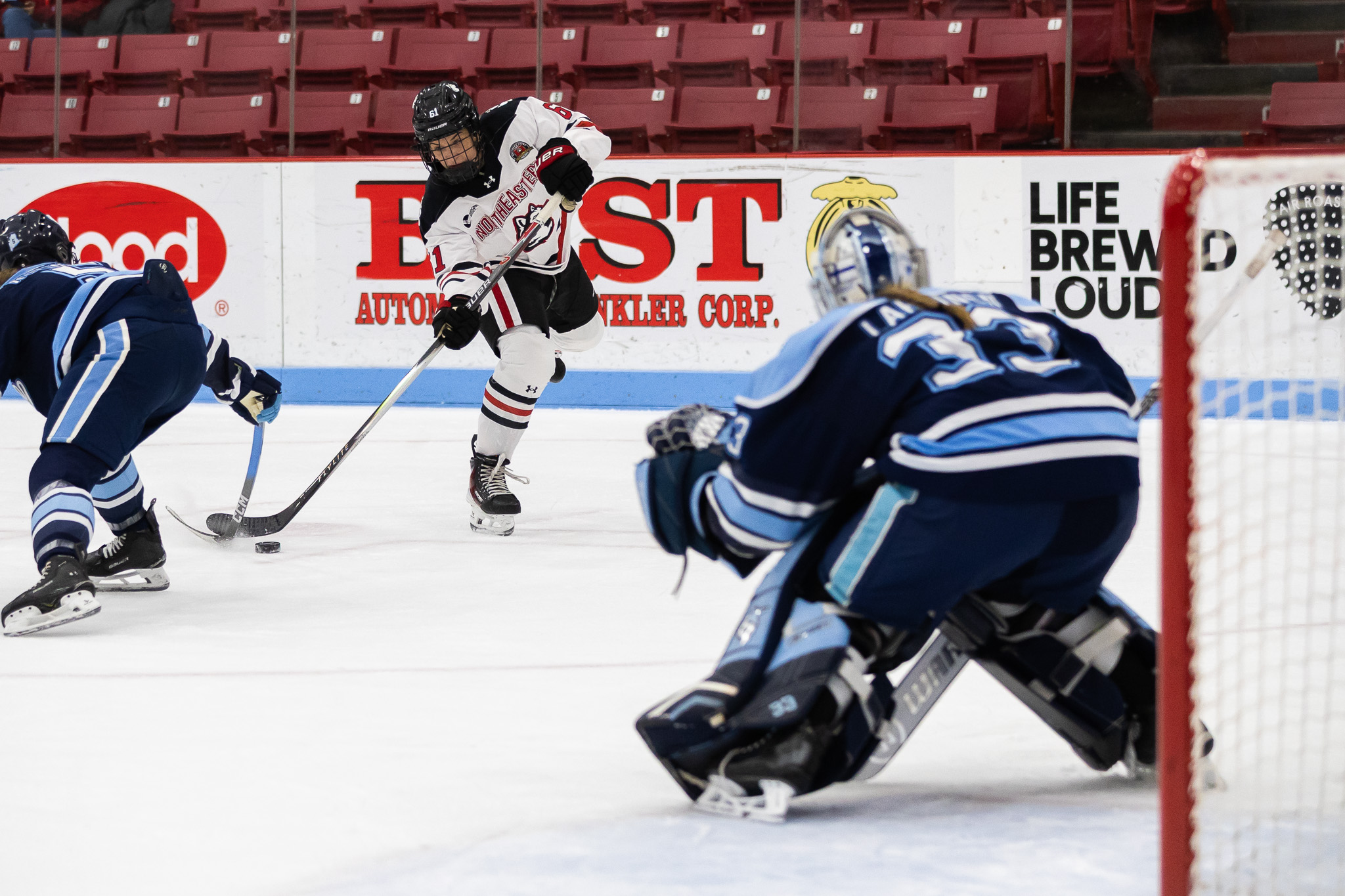 “It was good to see our offense put some pucks in the net,” said Northeastern head coach Dave Flint. “Up until this point, we’ve been playing really well, but we haven’t been scoring a lot of goals. It was nice that we got rewarded with some goals tonight.”