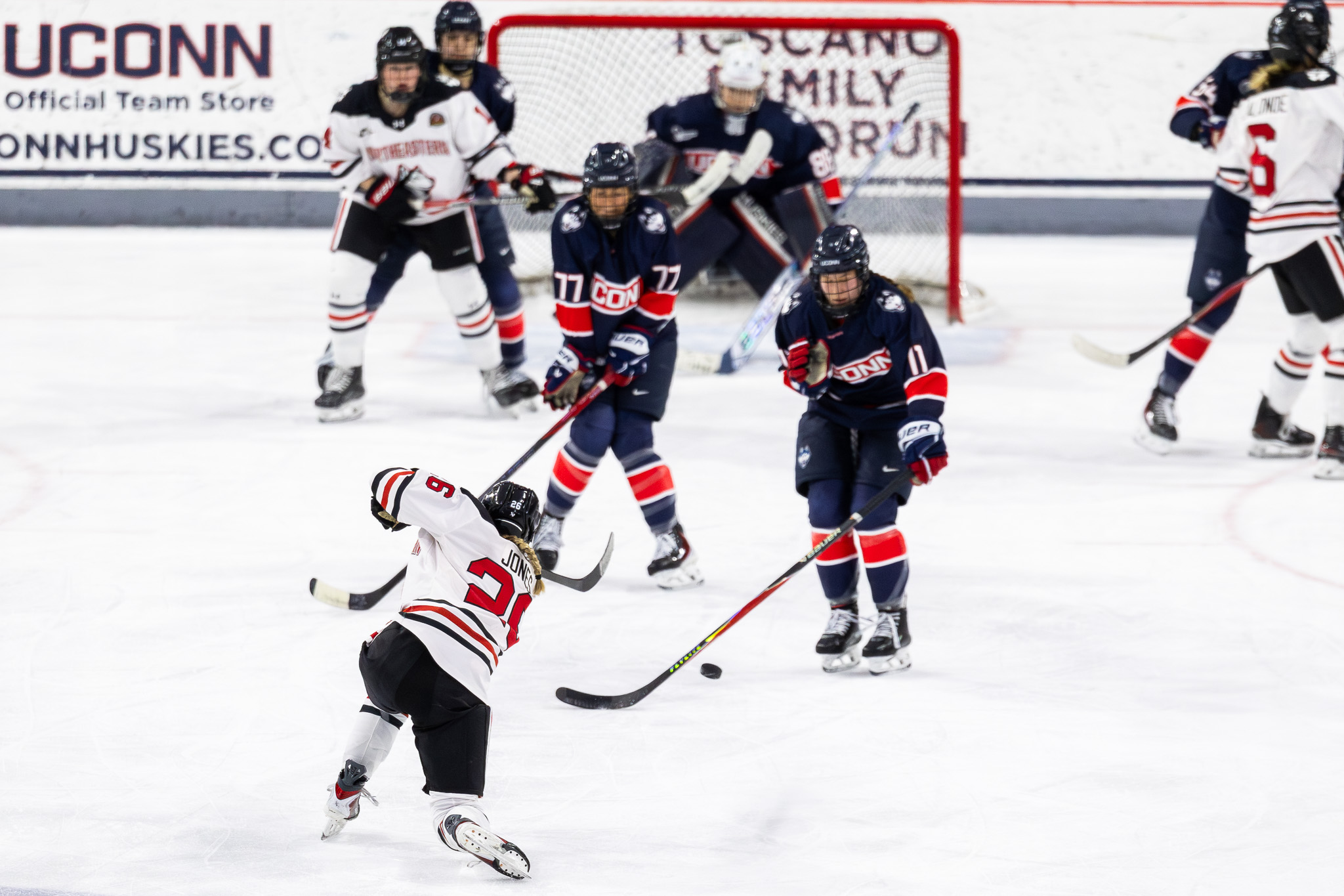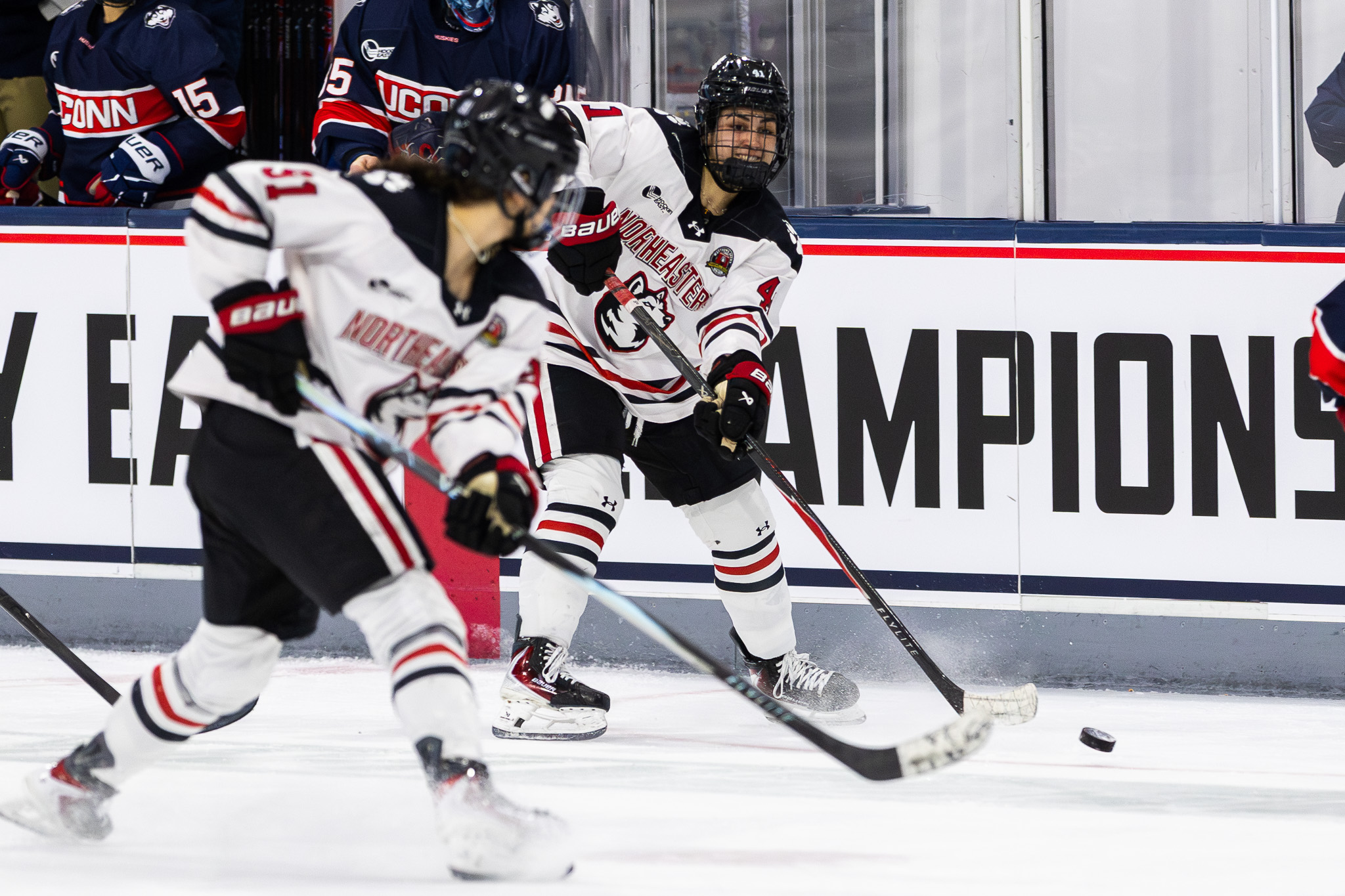 UConn outshot Northeastern through regulation 39-24, but when it turned to a sudden-death overtime showdown, it was clear the home team was tired. Northeastern dominated the extra frames, leading the shot tally 33-15, and on the ice, it showed. Northeastern was all over the attack zone, steering chances net-front and hemming UConn into their own zone for long stretches without any fresh legs.