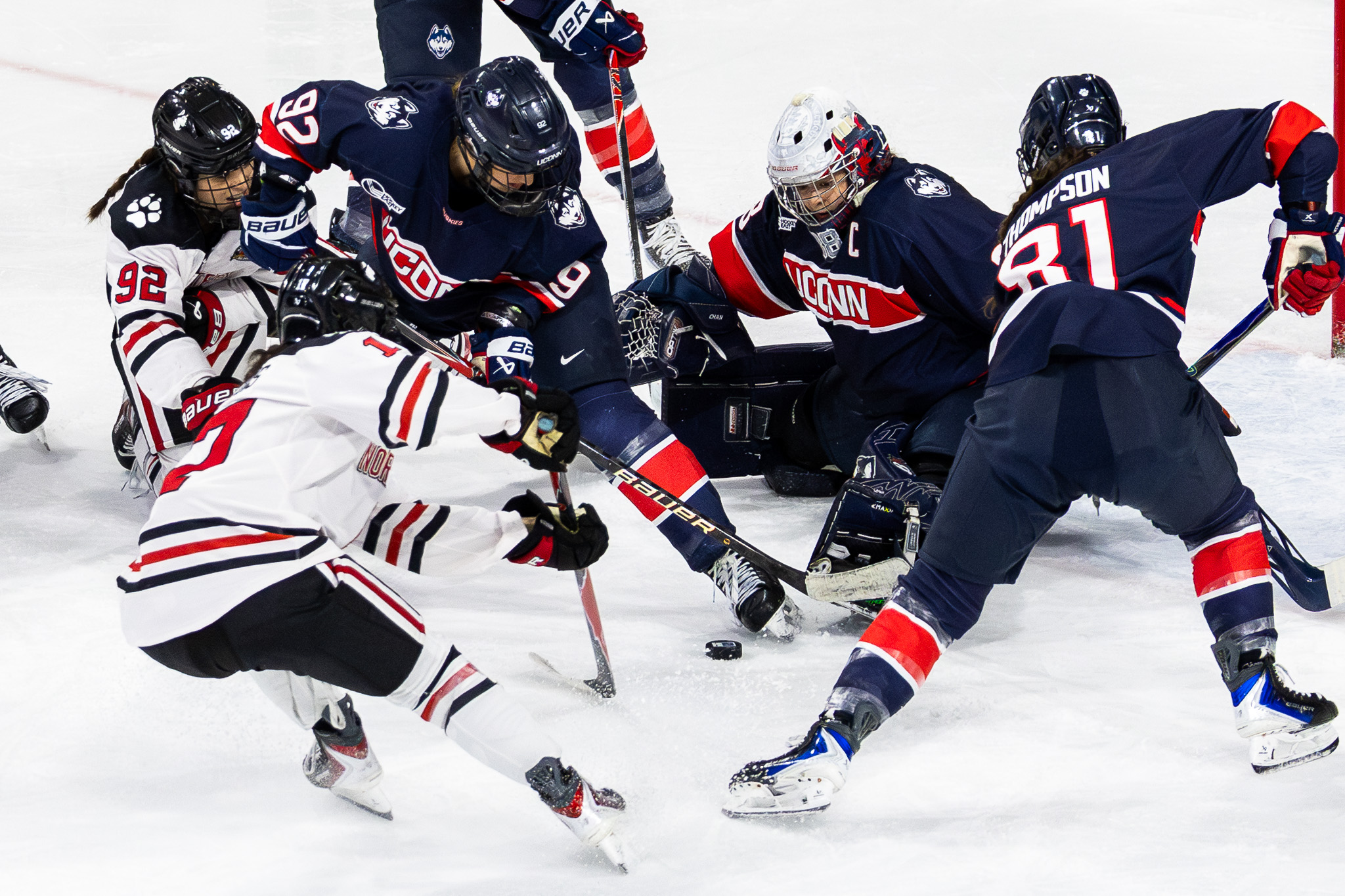 Both Lisa Jönnson (Northeastern) and Tia Chan (UConn) had career-high nights, with 54 and 56 saves, respectively. And many of those were high-danger opportunities, net-front from point-blank range, leading to highlight-reel saves on either end.