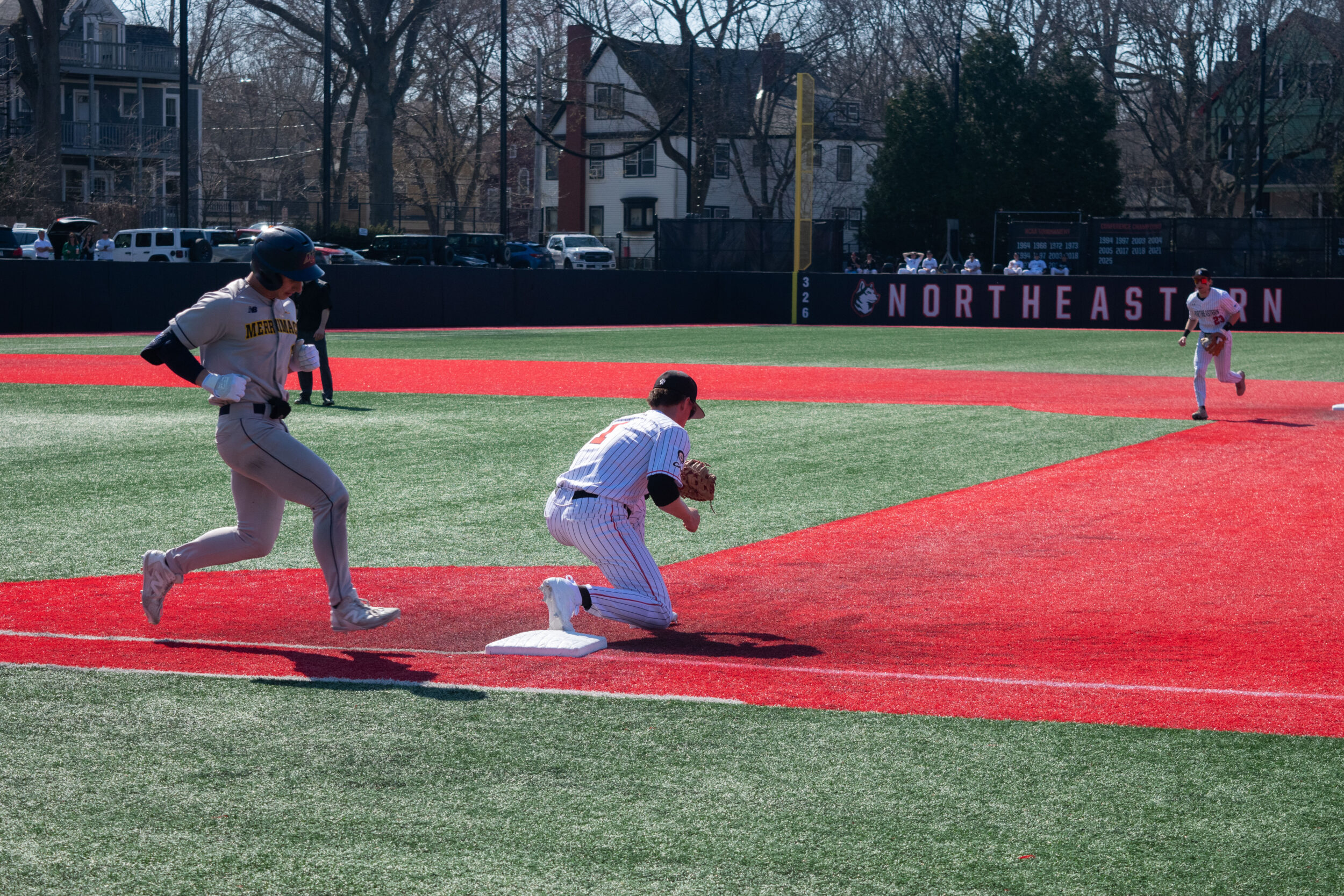 But the Warriors responded right away, facing off against Northeastern’s typical Friday starter, redshirt junior lefty Robbie O’Connor. After plunking the first batter he faced for his 22nd hit-by-pitch of the season and allowing a single to put two runners on, freshman catcher Garrett McGovern chopped a grounder to third base. Freshman Tyler Harmony, playing in just his fourth career game, was able to field it cleanly, but spiked the throw in front of fellow rookie AJ Aschettino, the first baseman unable to field it cleanly, allowing Merrimack to tie the game.